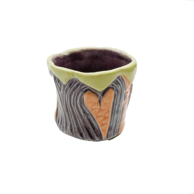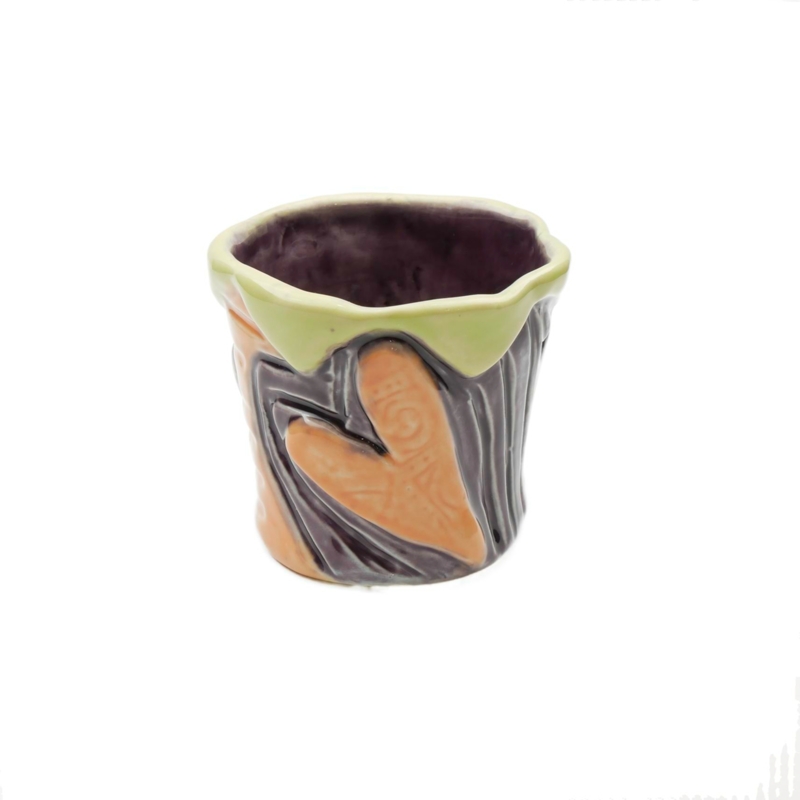 The ceramic cup with a unique, textured design. The cup features a heart-shaped motif with carved and molded lines, surrounded by a mix of earthy tones like orange, brown, and purple. The rim is accented with a greenish glaze, adding contrast to the overall piece. The texture includes raised ridges and a sculpted, emphasizing the handcrafted and artistic appearance.