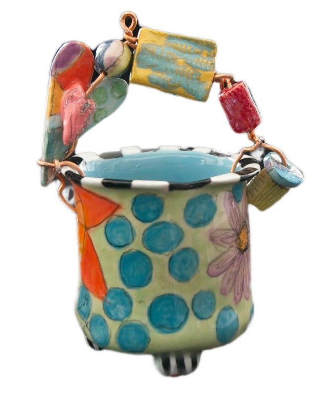 Oh, what a delightful treasure! Picture a charming, round vessel that seems to dance with magic and merriment. Its surface bursts with a vibrant sun, beaming rays of joy, surrounded by a garden of whimsical flowers that sway over a parade of wandering dots. The rim, oh so bold, struts its stuff with sassy black-and-white stripes. A line-up of enchanted ceramic beads that are strung together with flexible wire making an adorable handle. Each a tiny burst of charm—cheeky hearts whispering sweet nothings, sturdy rectangles standing proud, and bouncy little balls rolling with glee, all mingling with more rectangles for good measure. This is no ordinary vessel; it’s a magical keepsake, ready to hold your dreams and spark a smile with every glance!
