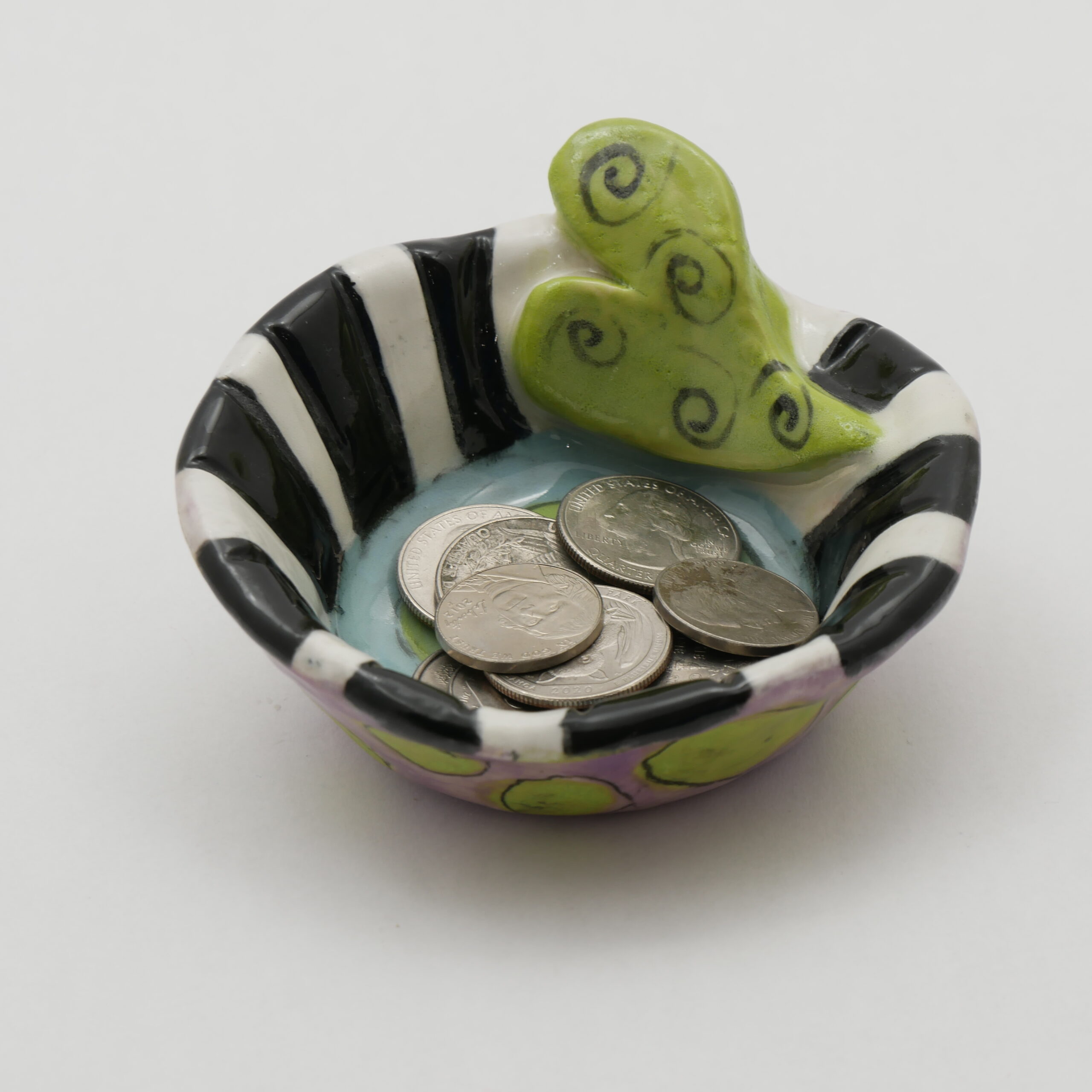 What’s a charming treasure keeper! Its colorful design and heart-shaped accent make it both decorative and functional for storing rings, earrings, coins, and other small items. The stripes and vibrant colors add a playful touch, while the bowl shape keeps everything neatly contained. It looks like a lovely addition to a dresser or nightstand!