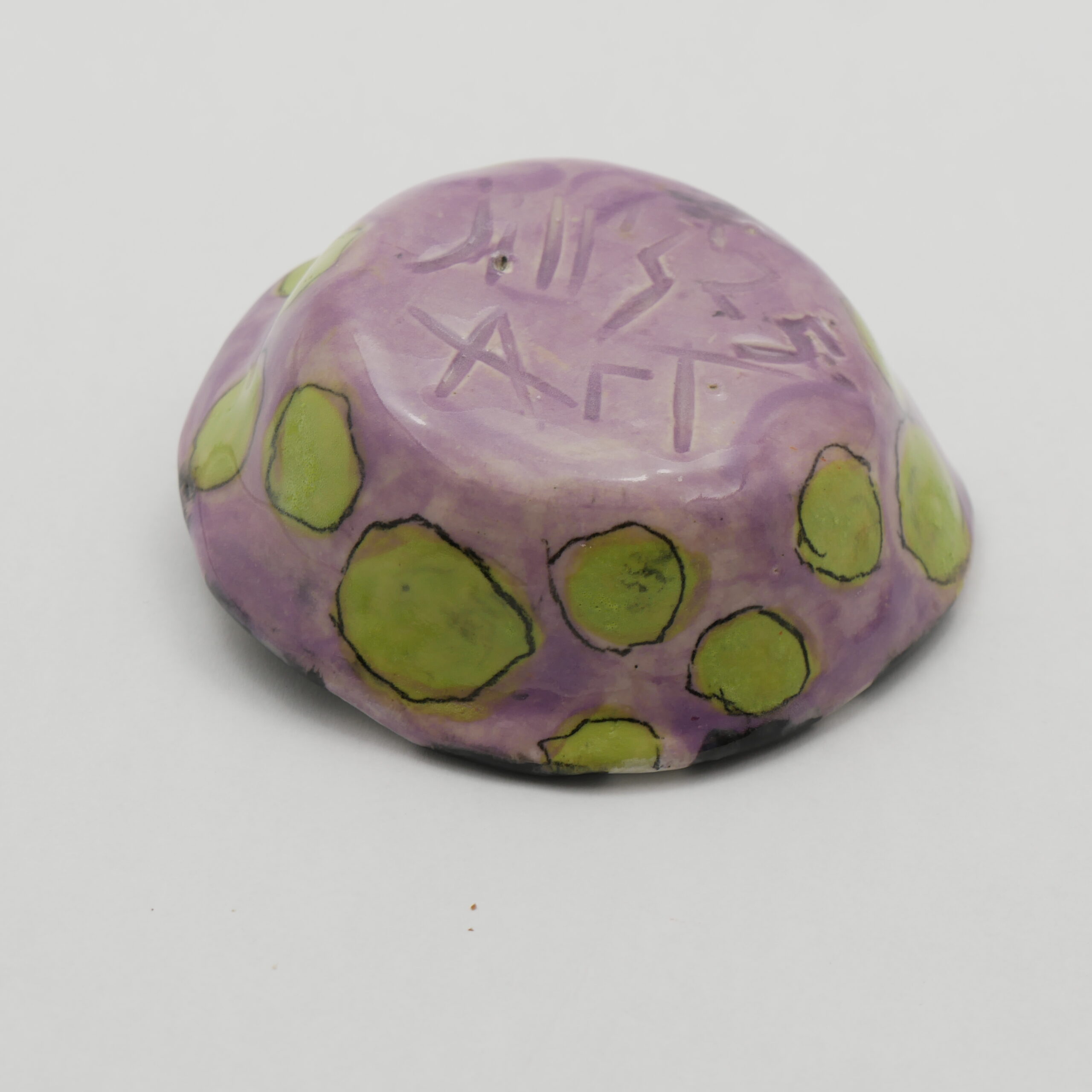 This piece was slab-built with stoneware clay. The free-form shape gives it a one-of-a-kind aesthetic. Colored pattern is made with underglaze topped with non zinc clear glaze.